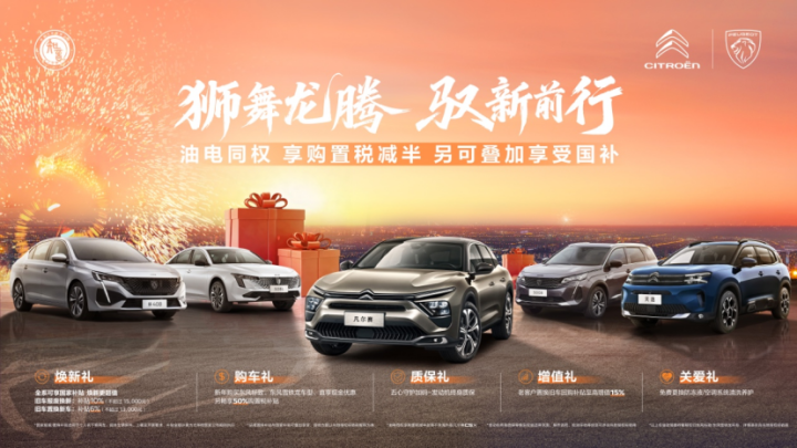 在延续冬季暖心服务行动的同时,神龙汽车也为购车用户准备了“油电同权 享购置税减半 另可叠加享受国补”政策及一系列新春购车礼遇,以切实优惠响应市场需求,助力消费者新年换新车。本次推出的购车权益涵盖多方面,有焕新礼:全系可享国家补贴 焕新更超值,旧车报废换新:补贴10%(不超过15000元),旧车置换新车:补贴6%(不超过13000元);购车礼:新年购买东风标致、东风雪铁龙全系车型,直享现金优惠及另畅享50%购置税补贴;质保礼:五星守护加码—发动机终身质保承诺;增值礼:老客户置换旧车回购补贴至高增值15%;关爱礼:免费更换防冻液/空调系统清洗养护。