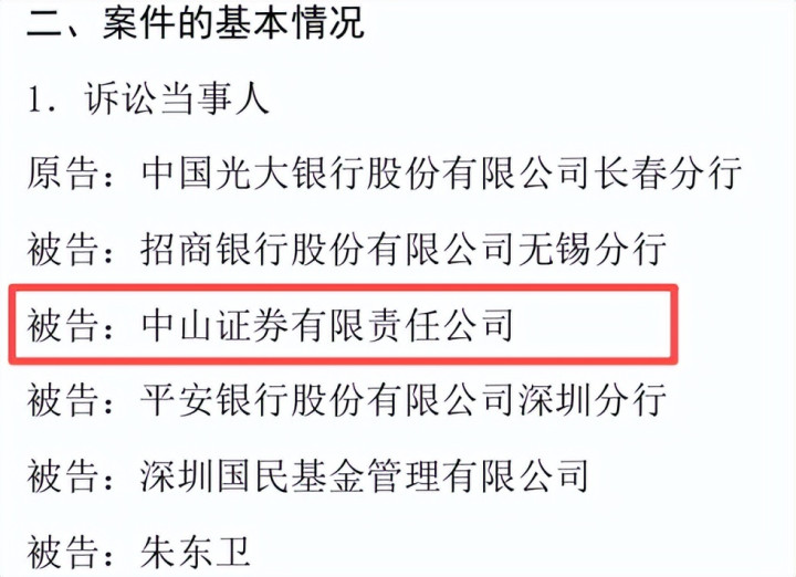 1月20日,锦龙股份发布公告称,控股子公司中山证券近日收到吉林省长春市中级人民法院《应诉通知书》(〔2026〕吉01民初7号),光大银行长春分行作为原告,以招商银行无锡分行、中山证券、平安银行深圳分行、国民基金及朱东卫作为被告,就侵权责任纠纷向吉林省长春市中级人民法院提起诉讼。
