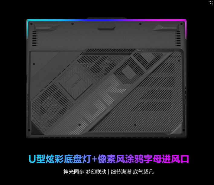 氛围拉满,颜值与手感双在线!ROG魔霸新锐 锐龙版还配有4区RGB影刃键盘、U型炫彩底盘灯,援助神光同步功能,可与键盘、外设等杀青梦乡联动,打造专属电竞房!
