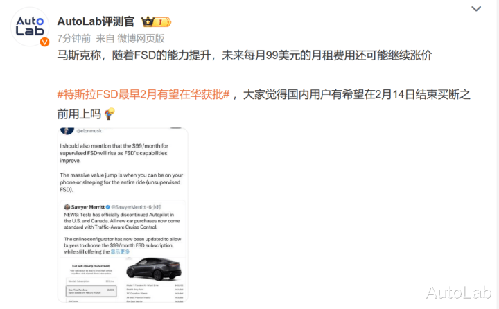 马斯克今天在论坛上表示:满血版的FSD最快下个月就能进入中国内地。