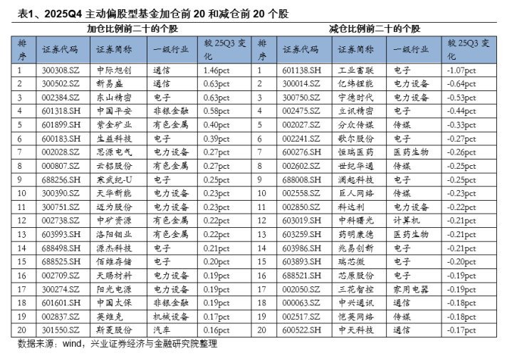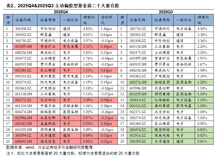 2025年四季度,主动偏股型基金加仓比例前5的个股分别是中际旭创、新易盛、东山精密、中国平安(601318.SH)、紫金矿业,持股比例较上一季度分别增加1.46pct、0.63pct、0.63pct、0.58pct、0.40pct;减仓比例前5的个股为工业富联、亿纬锂能、宁德时代、立讯精密、分众传媒,持股比例较上一季度分别减少1.07pct、0.64pct、0.53pct、0.44pct、0.33pct。