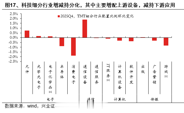 从TMT配置的内部结构上看,主动权益加仓通信设备与元件,减仓消费电子、半导体、游戏。2025Q4,主动权益在TMT内部增减持分化,其中主要增持通信设备、元件、光学光电子,增持比例分别为1.88pct、0.74pct、0.18pct;减持游戏、软件开发、广告营销,减持比例分别为0.82pct、0.37pct、0.32pct。