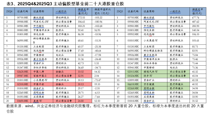 重仓股层面,腾讯连续维持公募的港股第一大重仓地位。截至2025年四季度,港股前5大重仓股为腾讯控股(00700)、阿里巴巴(09988)、中芯国际(00981)、中国海洋石油(00883)、信达生物(01801),持股市值分别为573亿元、307亿元、183亿元、92亿元、86亿元,与2025Q3相比,港股前20大重仓中,新增中国人寿(02628)、百胜中国-S(09987)、中国平安(02318)、美团-W(03690),同时,理想汽车-W(02015)、快手-W(01024)、京东健康(06618)、药明合联(02268)退出港股前20大重仓。