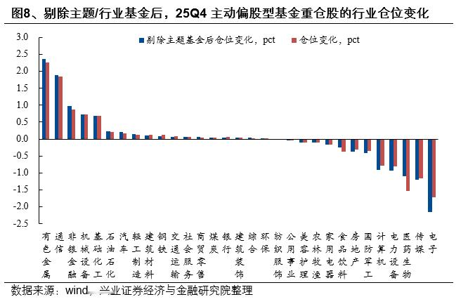 剔除主题/行业基金后,公募依然加仓有色金属、通信、非银金融、机械设备。将新能源/医药/消费/TMT主题或行业基金剔除后,25Q4主动偏股型基金加仓较多的行业是有色金属、通信、非银金融、机械设备,加仓比例分别为2.36pct、1.89pct、0.97pct、0.72pct,减仓较多的行业是电子、传媒、医药生物、电力设备,减仓比例分别为2.15pct、1.20pct、1.09pct、0.94pct。对比全口径来看,剔除行业/主题基金后,公募对电子板块的减持更加明显,而对于医药生物板块的减持有所降低。