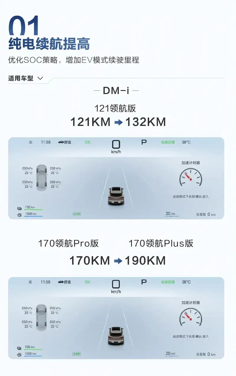 值得一提的是,前不久海狮06刚历程一次OTA升级,部分车型纯电续航有所普及:DM-i 121领航版由121km普及至132km;170领航Pro版和170领航Plus版续航由170km普及至190km。