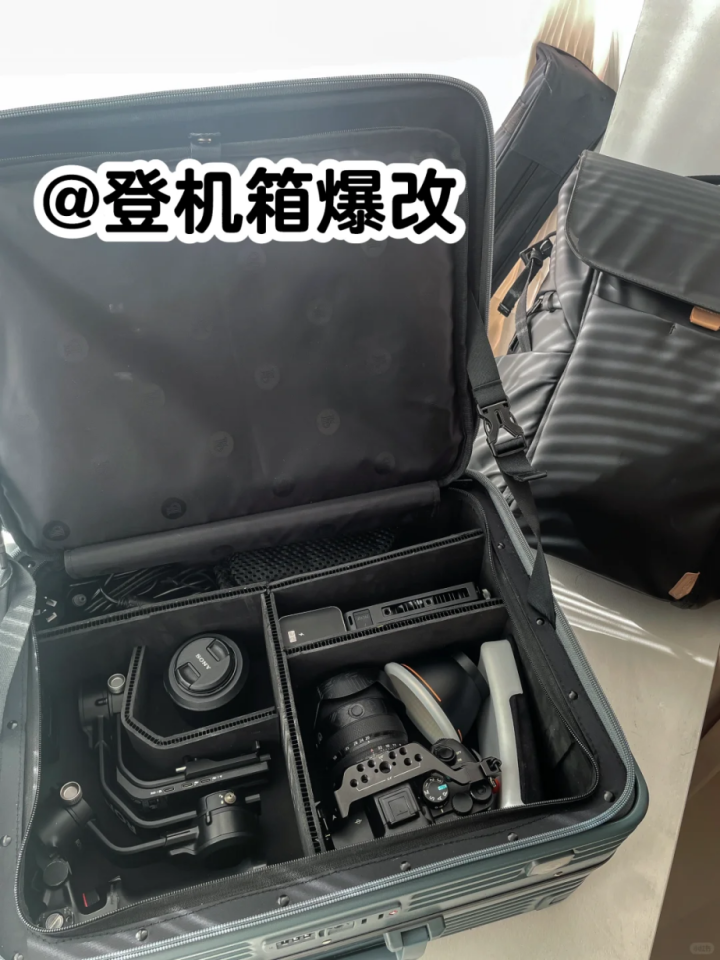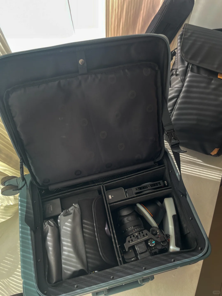 买专业摄影箱太贵,就把行李箱改装,内部用瓦楞隔板分格,铺EVA海绵防震,相机、镜头、三脚架各有专属位置,防震防刮。外出拍照直接拉着行李箱走,比专业摄影箱还实用。