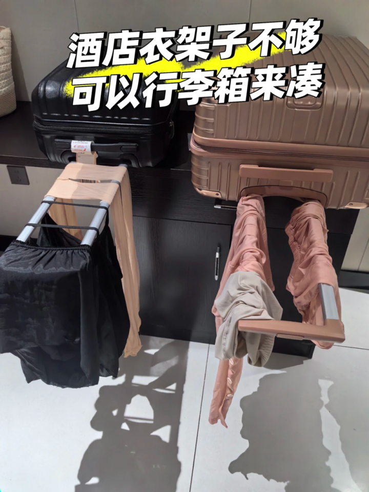 只要把行李箱的拉杆拉出来,就是临时晾衣架,晾衣服、晾毛巾、晾袜子, 拉杆结实承重力强,晒几件衣服完全没问题!