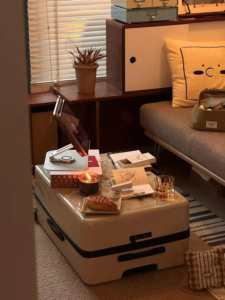 客厅小,摆个固定茶几挤到转不开身,行李箱直接变身移动小茶几。