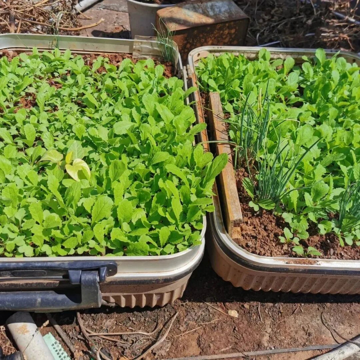 一直想种菜,买的盆子都不合适,就把废弃的行李箱翻出来了,底部打孔,铺防水布加泥土,直接变身超大种菜盆。