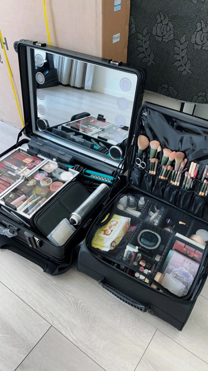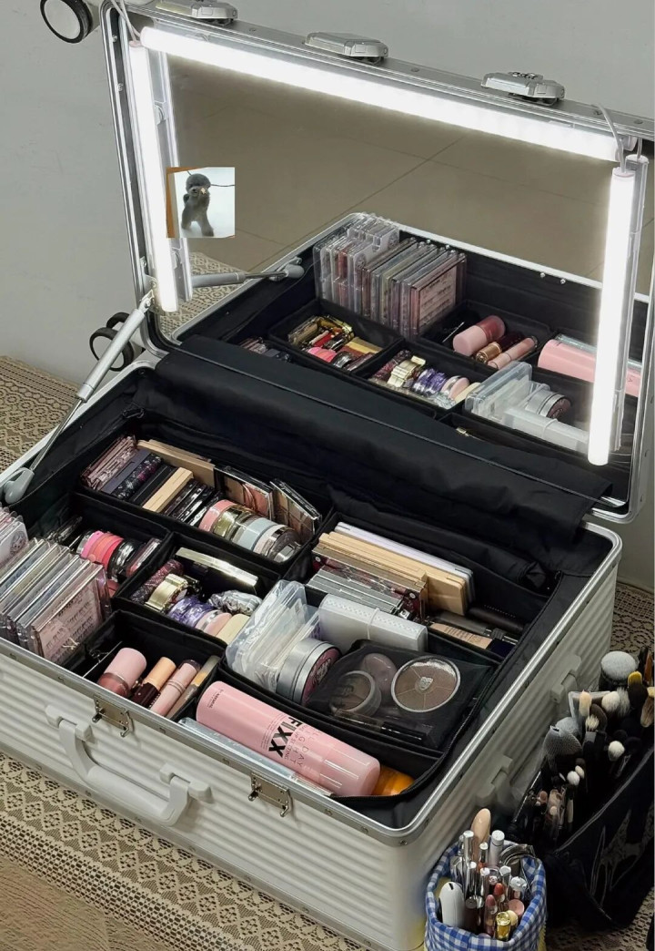 本化妆师经常要出门给别人化妆,化妆品太多实在不好收纳,把行李箱单改造一下就成了移动化妆台。